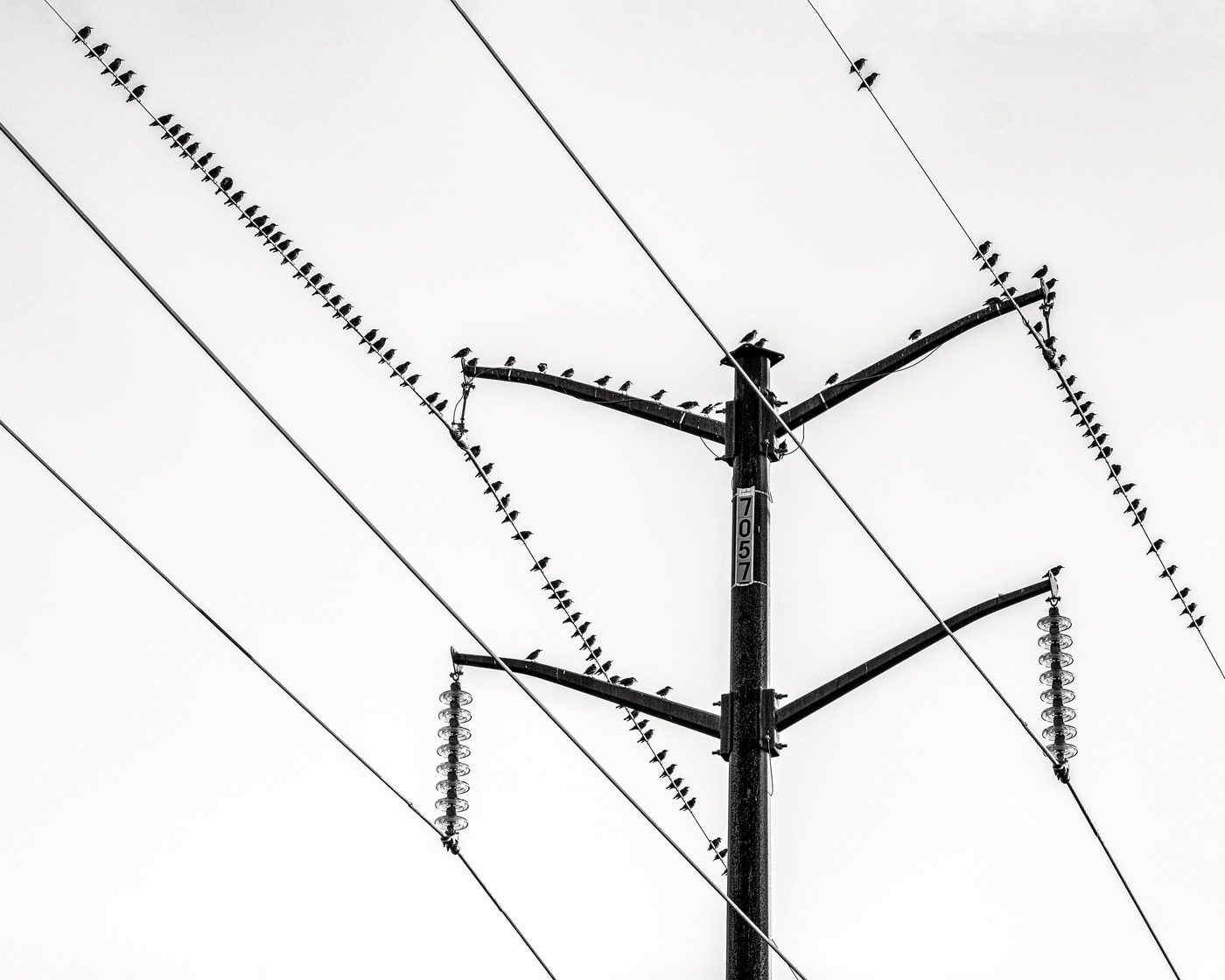 This photograph is of a flock of birds resting on power lines. The birds have arranged themselves in an interesting composition which plays well with the pole, glass supports and wires.