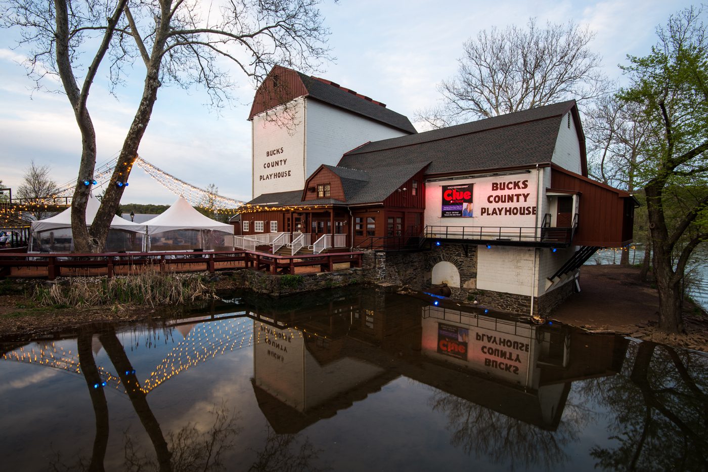 This digital photograph is an early spring photo of the Bucks County Playhouse in New Hope, PA. The blue sky, party lights and playhouse reflect in the placid water.
