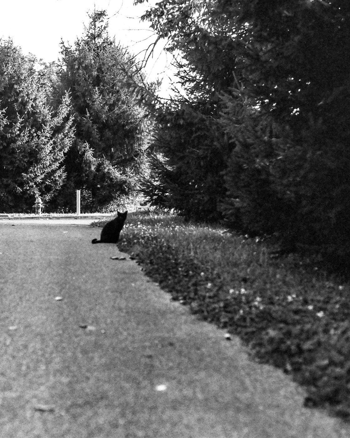 This film photograph is of a black cat sitting at the edge of a road.